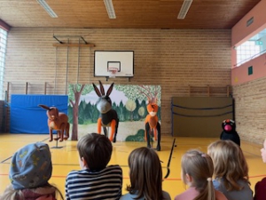 Ein Schauspieler brachte mit viel Humor und Geschick verschiedene Tierfiguren zum Sprechen und nahm die Kinder mit in eine fantasievolle Geschichte. Die Erst- und Zweitklässler verfolgten die Aufführung mit großer Begeisterung und hatten viel zu lachen.